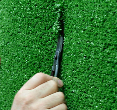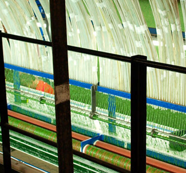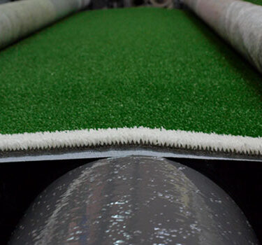 A machine fed by hundreds of spools sews the fabric to the backing or grass base. On the other side, blades cut the fiber to the desired height, density and stitch separation which will make the manufactured product with unique final technical characteristics.