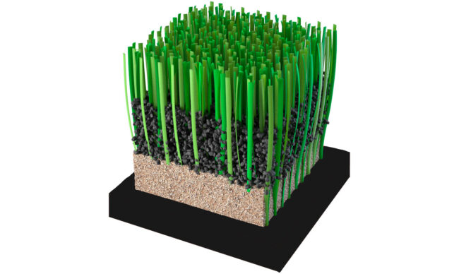 It´s 45 mm high, 13,00 decitex, ⅝ gauge between stitches and 14.5 stitches per linear meter, resulting in about 9,200 stitches per square meter and a total weight of 2.277 gr. Also, the fibers that make up the system have a UV treatment resistant to extreme weather conditions.