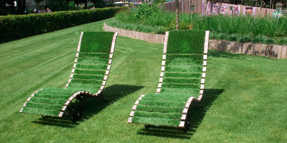 - Cualquier mueble de madera queda ideal con el césped artificial, una pequeña mesa, silla o tumbona, si son plegables podrás recogerlas cuando no las necesites.