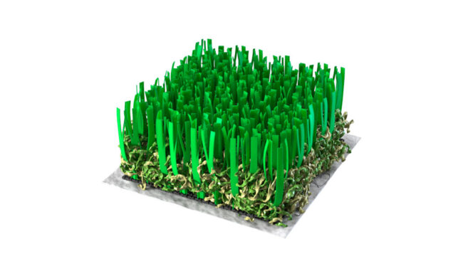 This product has a 32 mm height, woven by in-line Tufting system and a gauge of ⅜ inches between stitch lines, 16,800 stitches per square meter, thickness of 400 µm on monofilaments, and a thickness of 110 µm on fibrillated, a total weight of 4,010 g/m² and 20,300 decitex. The anti-UV treatment of fibers makes it exceptional and resistant to extreme weather conditions.